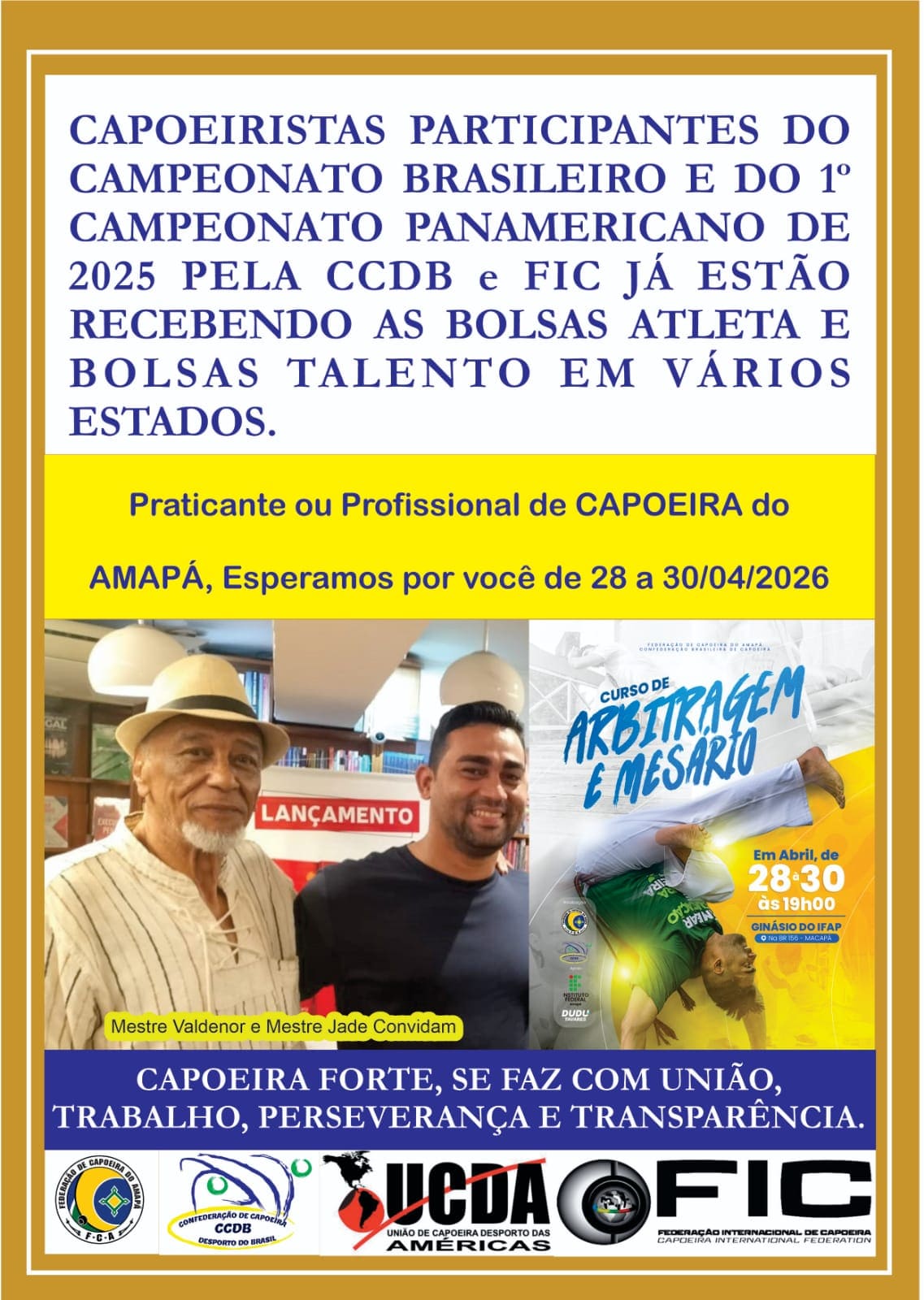 A Federação de Capoeira do Estado do Amapá (FCA) reafirma seu compromisso com o fortalecimento, a valorização e a profissionalização da capoeira enquanto modalidade esportiva e patrimônio cultural brasileiro, ao anunciar a realização do Curso de Formação de Árbitros e Mesários de Capoeira Desporto.